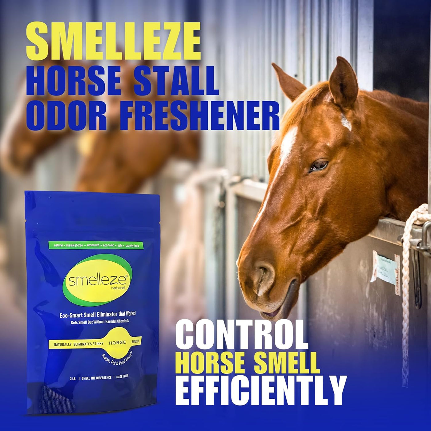 Smelleze® Natural Horse Smell Deodorizer Granules were specially developed to adsorb, neutralize, and encapsulate offensive urine generated ammonia odors and wetness. Smelleze® will eliminate malodor in stalls, stables, feed lots, animal pens and trailers. This will create a healthier environment for livestock, reduce fly infestation and thrush, extend bedding life, reduce stall maintenance, and result in drier stalls. The latter is particularly advantageous to newborns and sick or injured animals that are confined to stalls.